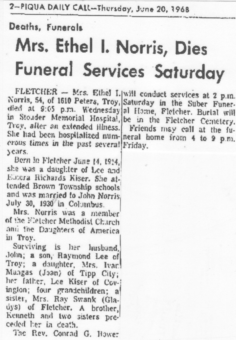 Norris, Ethel I (Kiser) June 20, 1968