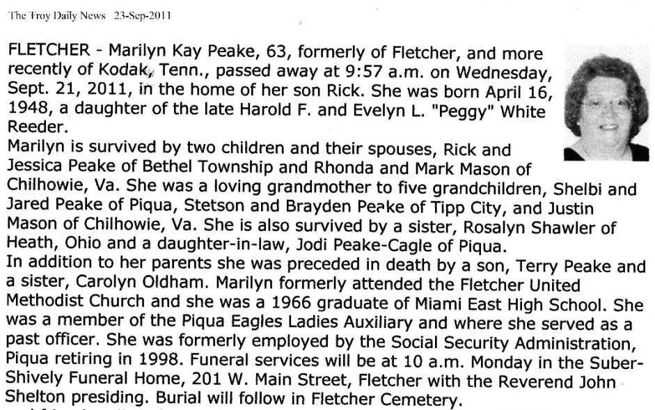 Peake, Marilyn Kay (Reeder) September 23, 2011 |