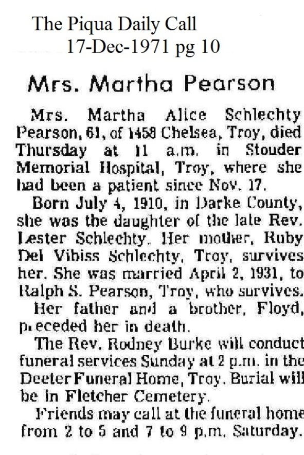 Pearson, Martha Alice (Schlechty) December 17, 1971 |