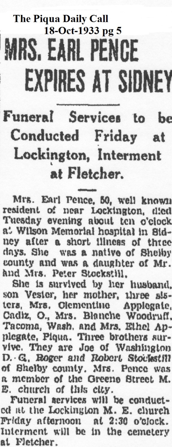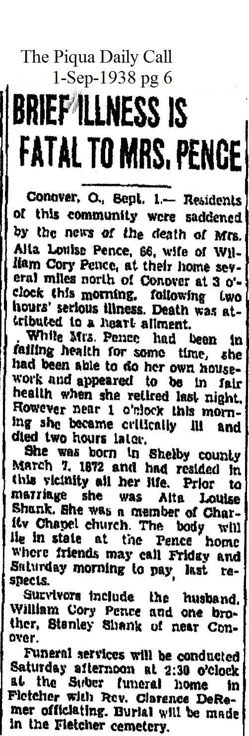 Pence, Alta Louise (Shanks) August 31, 1938 |