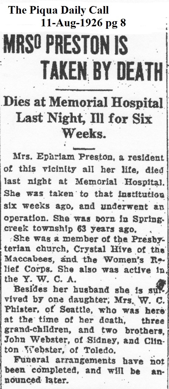 Preston, Laura Frances (Webster) August 11, 1926 |