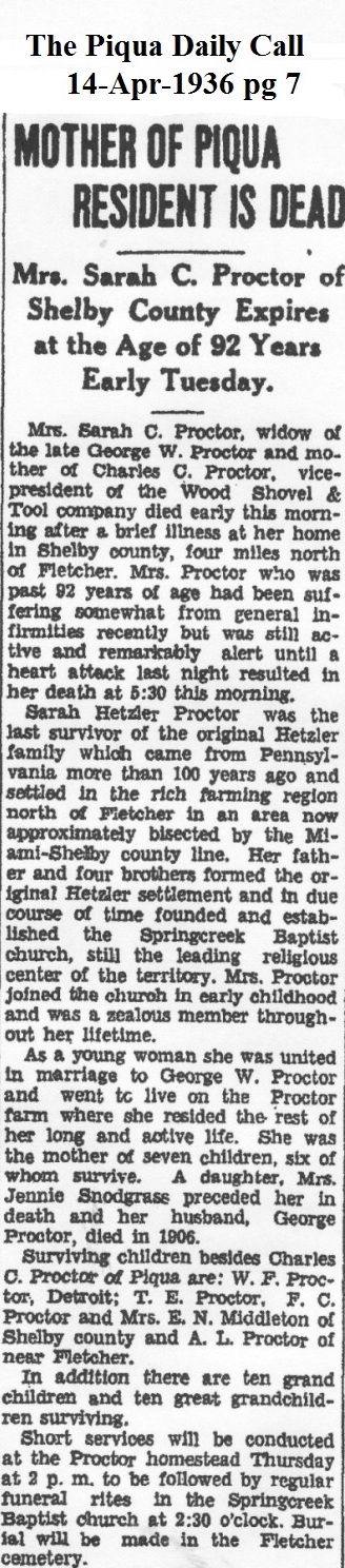 Proctor, Sarah C (Hetzler) April 14, 1936 |