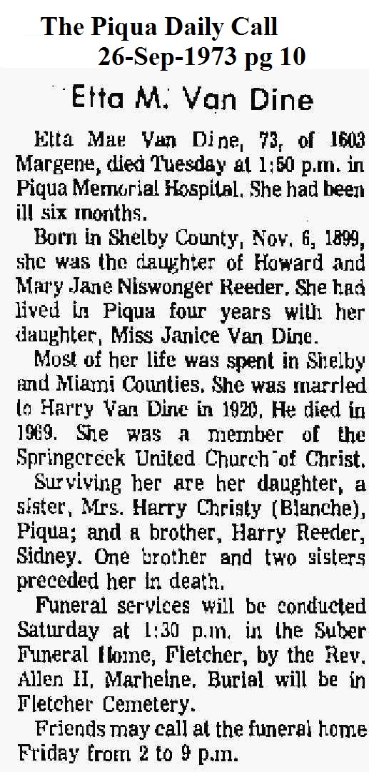 Van Dine, Etta Mae (Reeder) September 26, 1973