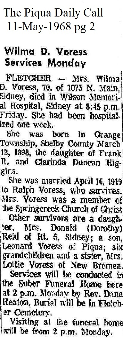 Voress, Wilma D (Higgins) May 11, 1968